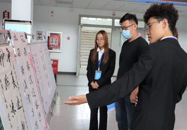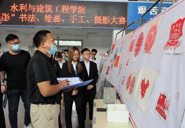 翰墨怡乐,影藏幸福。在讲解员的带领下,各位评委老师仔细欣赏作品,详细了解作品的内容和创作理念,对整个作品进行综合审评并进行打分。评委们首先观看硬笔书法的两个主题的作品并进行高度评价:“书法作为一种较为特殊的艺术形式,能够准确的表达出共青团的百年征程,共青团历经百年沧桑而青春焕发,依靠的就是始终扎根广大青年,希望各位青年继续奋斗,为团贡献力量。”随后评委老师相继参观了照片、软笔、画作和手工剪纸。现场观众也融入其中,欣赏作品。