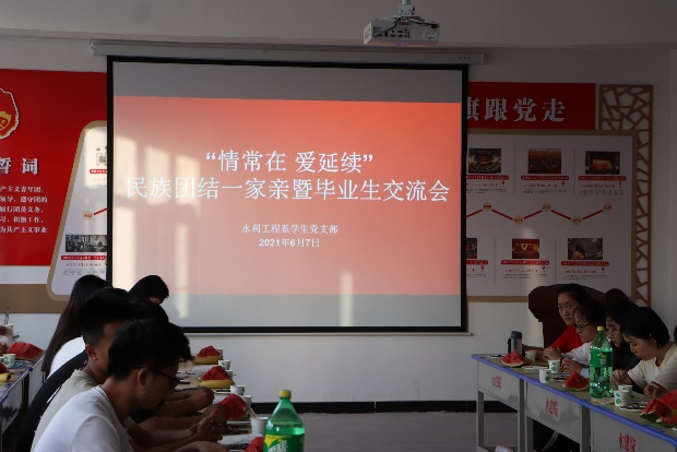 为增进毕业生与在校生的交流,促进民汉学生及师生间的团结交流,水利与建筑工程学院水利工程系学生党支部于2021年6月10日在学院党团校举行了“情常在 爱延续”民族团结一家亲暨毕业生交流会。水利工程系党总支书记李林、水利工程系学生党支部书记王小云、水利工程系全体党员及在校生代表参加了活动。
