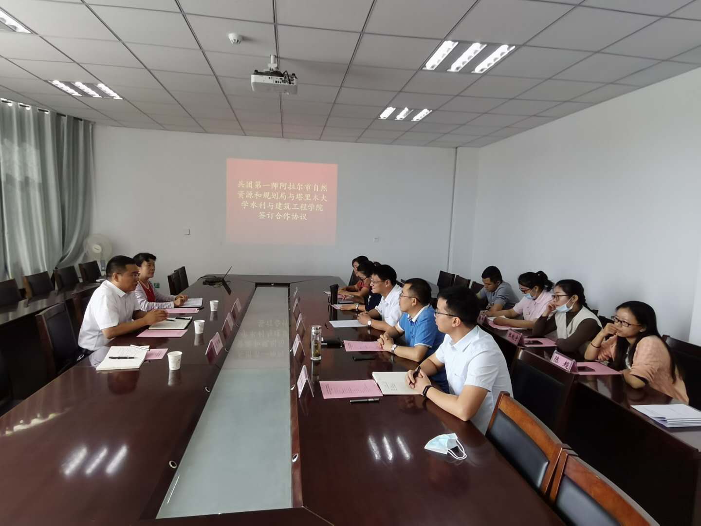 2020年9月16日上午,第一师自然资源与规划局主持工作的党组成员、副局长商钢锋同志带领组织人事科负责人王红彬、效能监察室负责人高秀群一行3人,到塔里木大学水利与建筑工程学院,与塔里木大学签订人才培养与交流合作协议。我院党委书记朱连勇、党委副书记李新、建筑规划系书记孙海燕、建筑规划系主任唐拥军,以及建筑规划系部分教师代表参加会议,会议由李新同志主持。