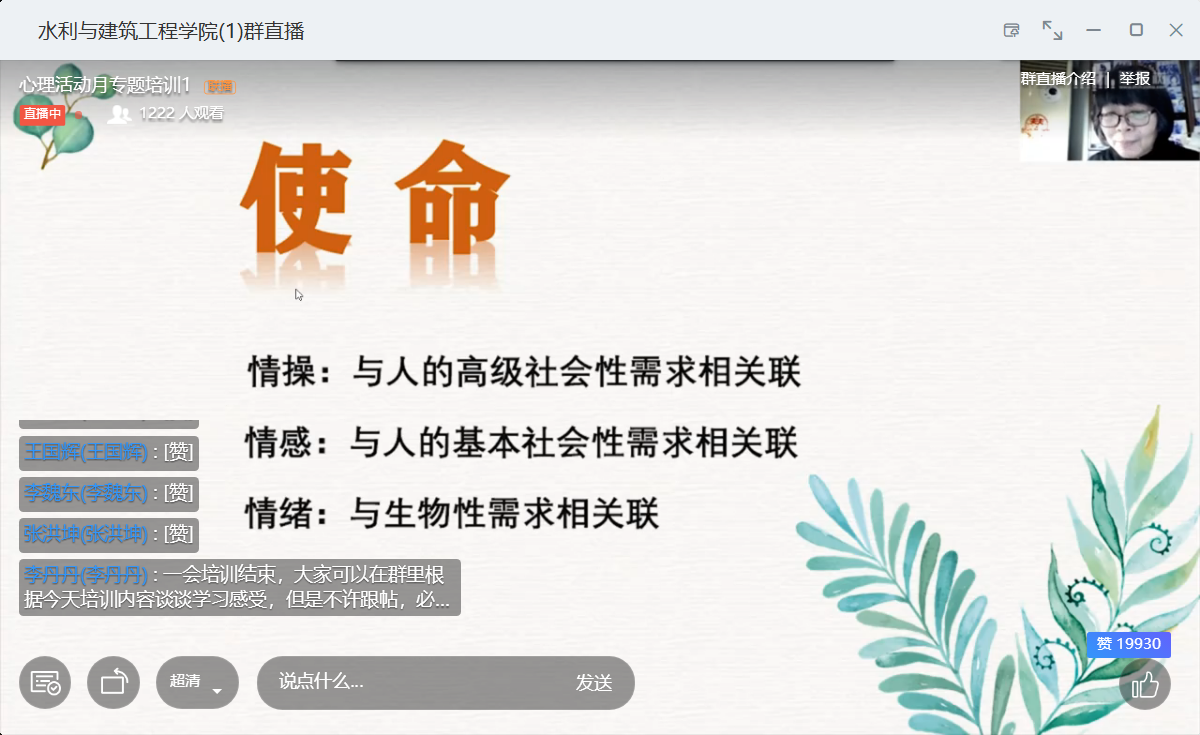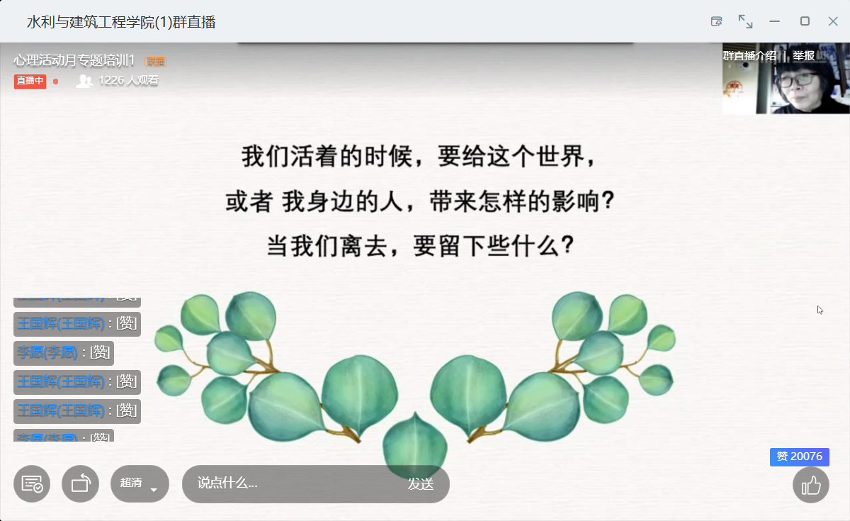 在说到生命这个话题时,张海燕老师提到:“生命不可能有两次,但许多人连一次也不善于度过。所以我们活着的时候,要思考,自己能给这个世界或者我们身边的人带来怎样的影响?当我们离去时,又将要留下些什么?”而这也引发了同学们的深入思考,王江磊同学说到:“使命担当,勇担祖国建设重任!既要像众多白衣郎一样,在祖国最需要、最难的地方奉献自己,挥洒青春的汗水;也要像胡杨一般,守护祖国的每一片土地。”郭文斌同学说到:“珍爱生命,热爱生活,懂得感恩,要有理想,有行动。”最后,活动在1200余人激情的点赞讨论中落下帷幕。