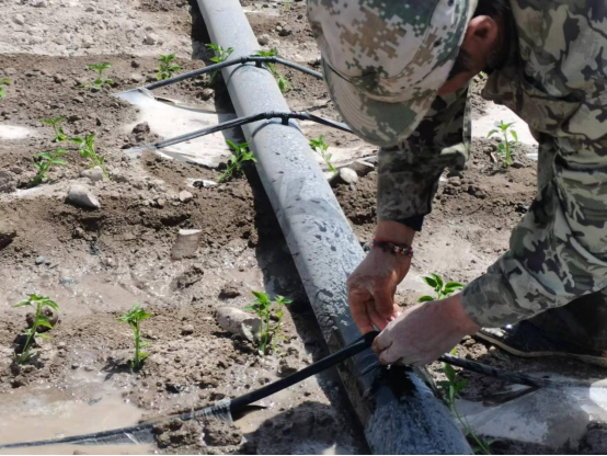时下正值当地支柱产业棉花出苗及辣椒移栽的关键时期,由于今年气候反常,季风多,风力大、气温低等情况,为保证色素辣椒的成活率,团队成员对22团9连辣椒移栽过程中滴灌带的连接铺设及灌水情况进行了现场指导,有效制止了在灌水过程中的跑冒滴漏现象,增强科学灌溉、合理用水的思想观念,使每一滴水都能发挥其应有的作用,受到了连队职工的一致认可。