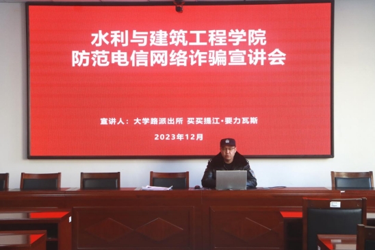 为进一步提高我院教职工的反恐反诈安全意识,着力提升学院安全防范水平。12月6日下午,学院邀请大学路派出所在工科实训大楼一号会议室开展了主题为“加强反恐反诈宣传,共筑校园安全防线”的现场宣传活动,由大学路派出所副所长买买提江·要力瓦斯、民警谭川林主讲,水建院全体教职工参加。