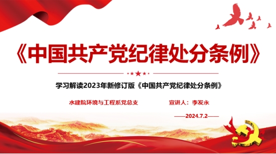 为进一步学深悟透习近平总书记关于党的自我革命的重要思想,引导党员切实加强经常性纪律教育,持续深入学习《中国共产党纪律处分条例》,准确把握开展党纪学习教育的重大意义和目标要求,7月2日,环境与工程系党总支在工科实训大楼三号会议室专题学习新修订的《中国共产党纪律处分条例》(以下简称《条例》)。党总支书记李发永领学,全体党员同志参加了学习。