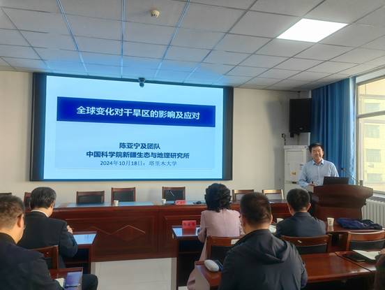 10月18日上午,塔里木大学水利与建筑工程学院举办了“全球变化对干旱区影响及应对”专题报告会。本次报告会特邀中国科学院新疆生态与地理研究所研究员、荒漠与绿洲生态国家重点实验室主任、国家重大科学研究计划项目首席科学家陈亚宁研究员莅临主讲。塔里木大学党委书记张爱萍,党委常委、副校长汤智辉等领导出席报告会。