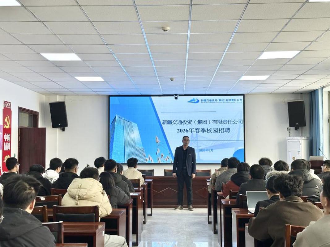 为进一步搭建学生与优质企业的沟通桥梁,拓宽就业渠道,助力我院学子高质量就业,3月16日,新疆交通投资(集团)有限责任公司2026年春季校园招聘宣讲会在工科实训大楼一号会议室顺利举行。