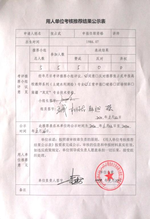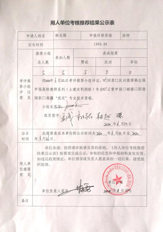 根据兵团、学校职称工作要求,经单位审核小组审核通过,报专家考评推荐小组评议,同意推荐韩志强、张占武同志参加2020年上半年高校教师系列考核认定。现将《用人单位考核推荐结果公示表》在本单位网站进行公示。